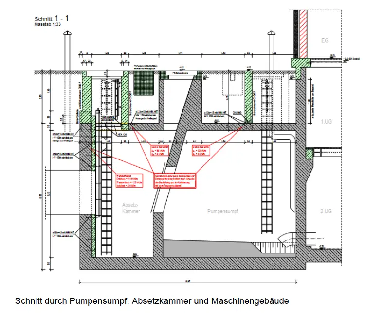 Dazu erfolgten Abbruch und Einbau neuer Aussteifungselemente sowie Decken mit Öffnungen zur Pumpenentnahme. Auf dem Schachtbauwerk wurde ein neues Betriebsgebäude errichtet.