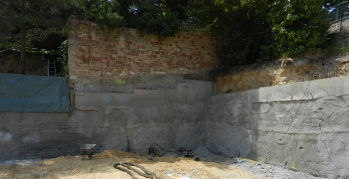 Unterfangung historische Natursteinwand zum Neubau einer Tiefgarage