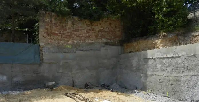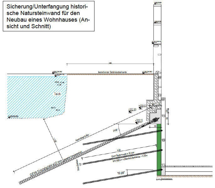 Zum Neubau einer privaten Tiefgarage wurde eine Naturstein-mauer, hinter welcher sich eine große Zisterne befindet mit rück-verankertem Fußbalken unterfangen. Unterhalb des Fußbalkens wird eine Bodenvernagelung zur Baugrundsicherung hergestellt.