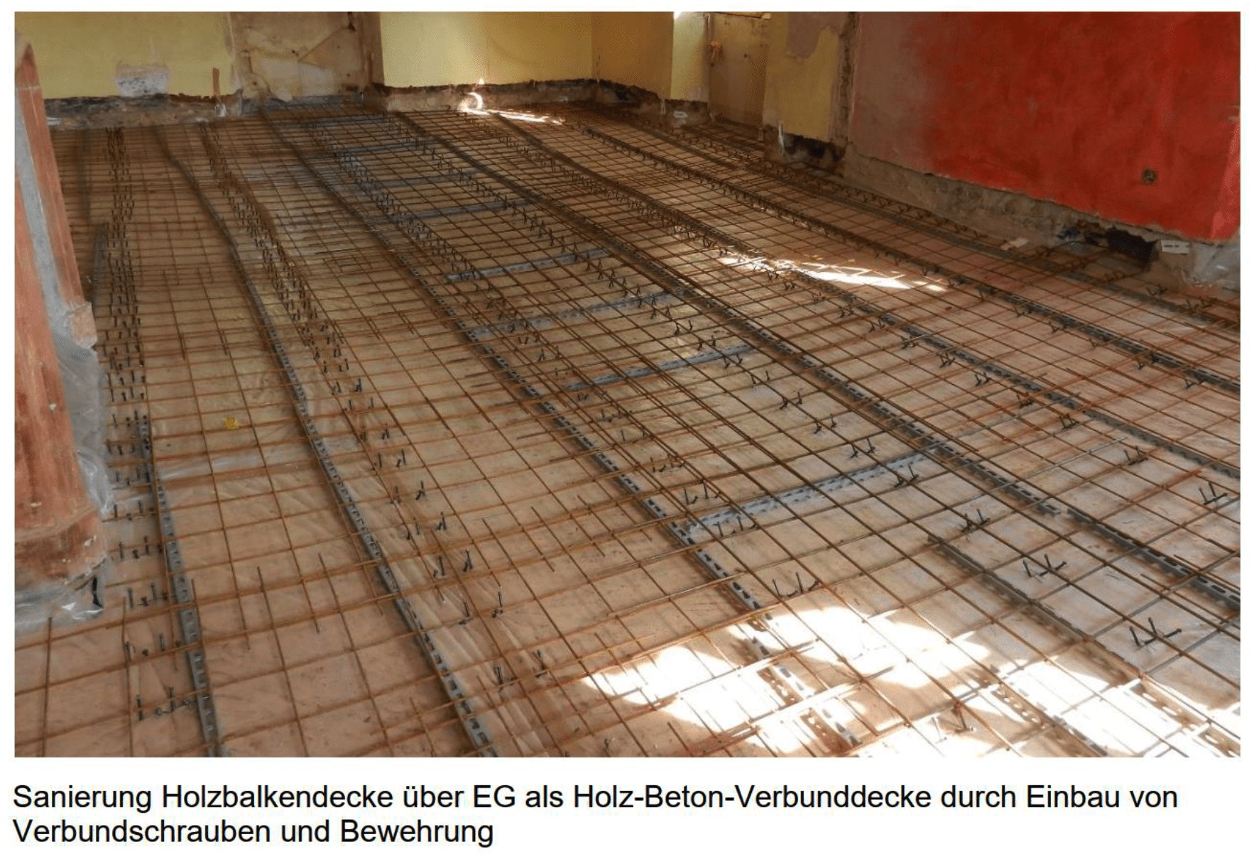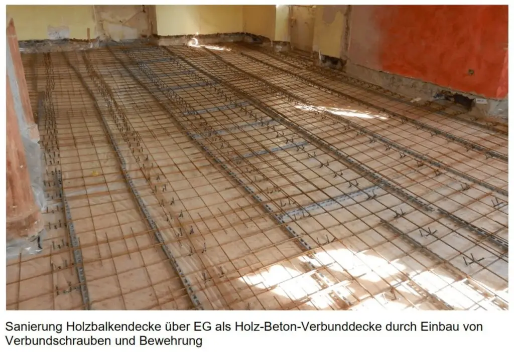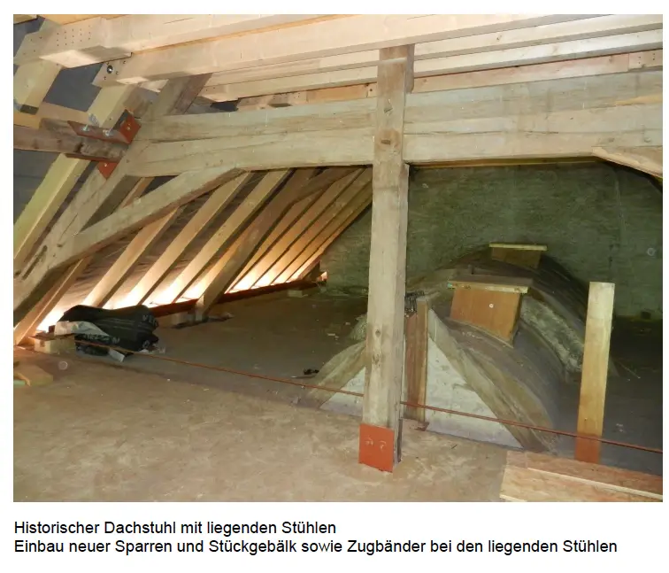 Die Holzbalkendecken erhielten durch den Ausbau zu Holz-Verbunddecken eine statische, brandschutz- und schallschutztechnische Verbesserung. Zusätzlich wurden die Dachstühle saniert und ausgebaut.