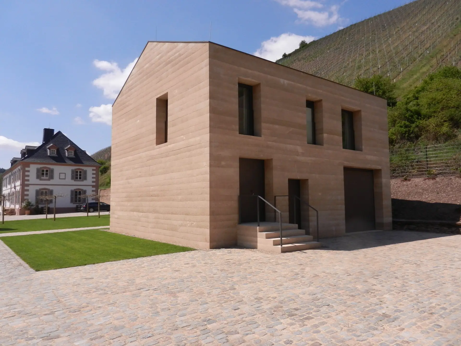 Ergänzend entstand ein neues Nebengebäude (Gästehaus) mit Stampfbetonfassade und -dach.