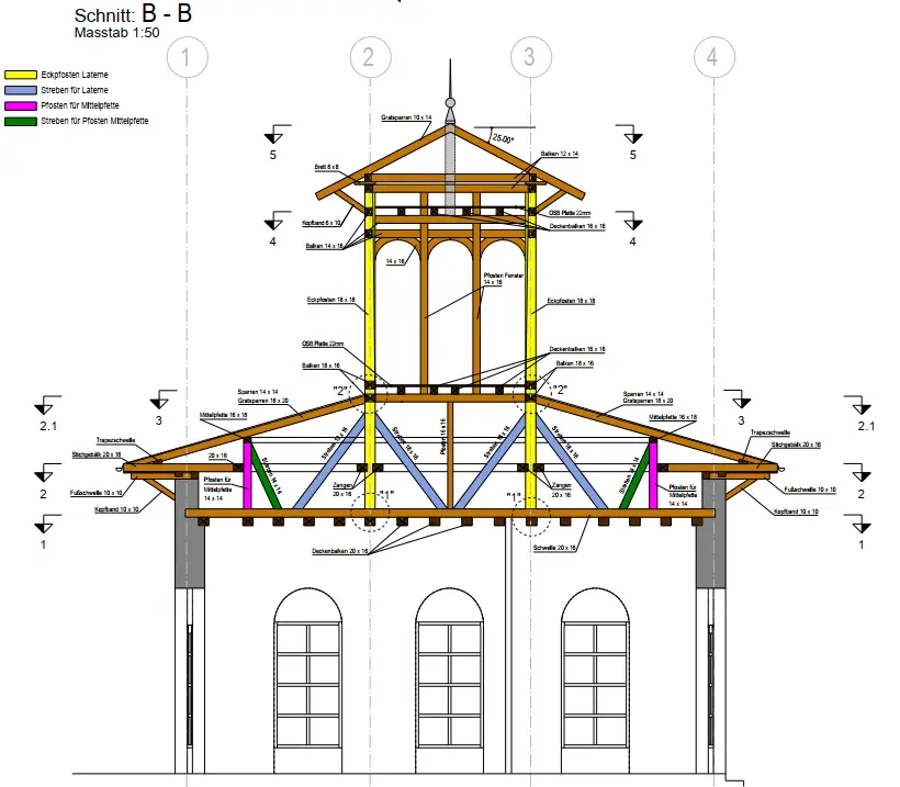 Das Laternenbauwerk besteht aus vier quadratisch angeordneten Eckstützen mit integrierten Holzdecken. Die Ablastung erfolgt in der unteren Deckenebene über Holzüberzüge auf den Innenund Außenwänden. Zur Aussteifung dienen Holzstreben und Fußbänder im Bereich der Holzbalkendecke.